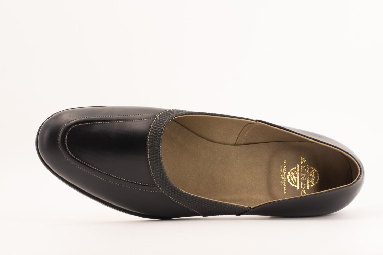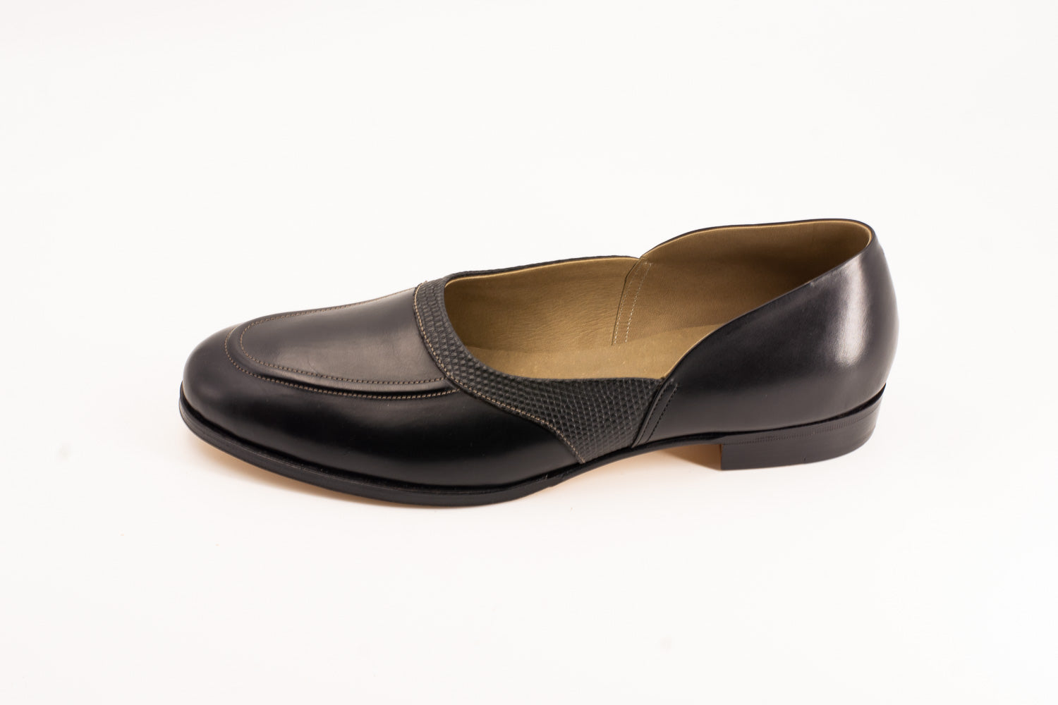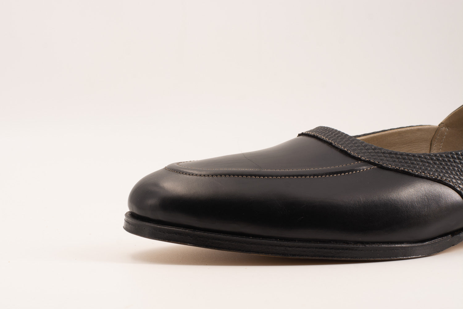 「Grecian slipper 」 2ピースで組まれたこの特徴的なデザインの靴は、古代ギリシャにルーツがあるとされています。20世紀には多くの映画スターやアーティスト達に着用され、今でもその着画が多く残っています。