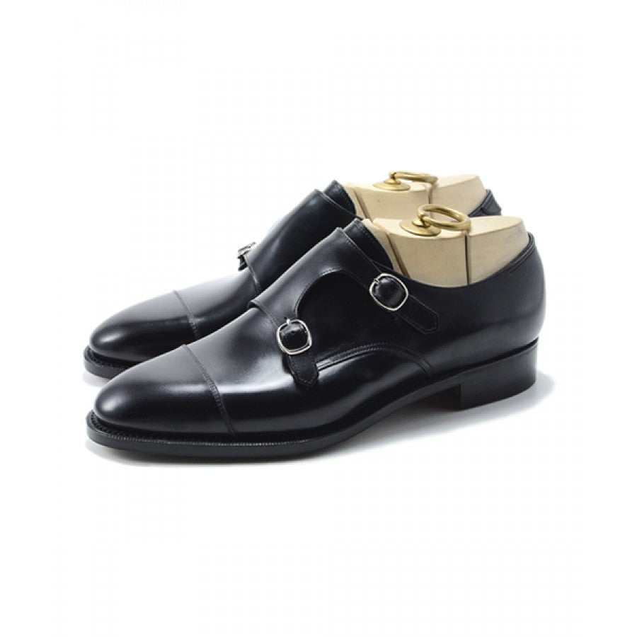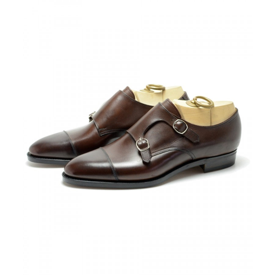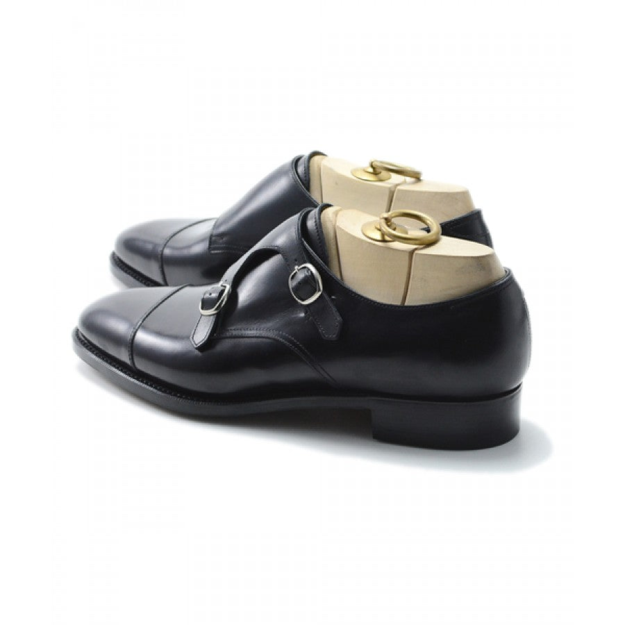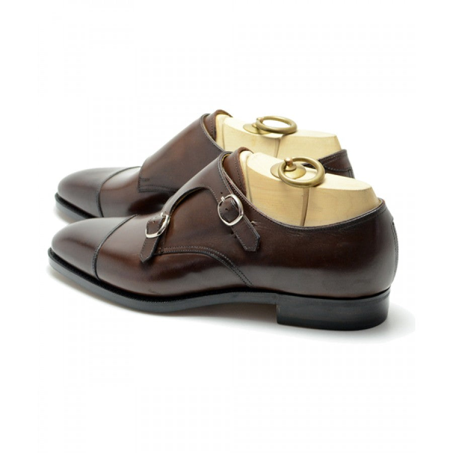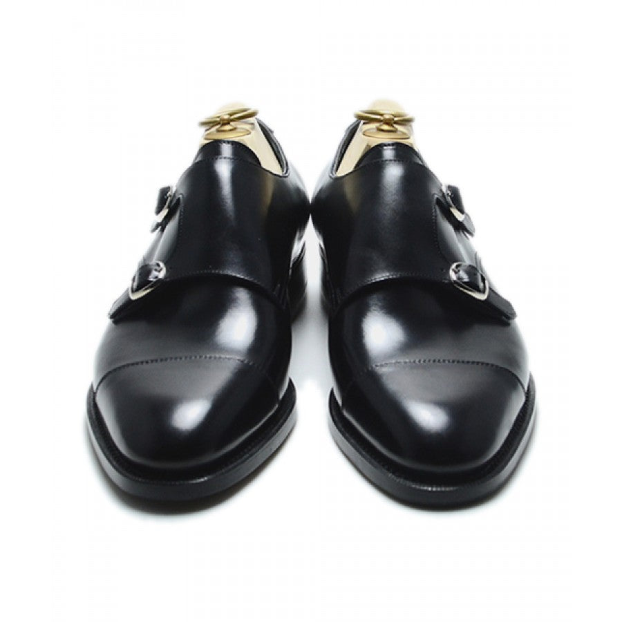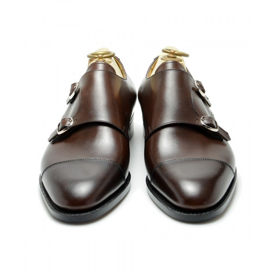 2対のストラップとバックル(金具)をベルトのように留めることで、足をフィットさせる構造のダブルモンク。パターン上では、甲部分に広い面が重なるため、あまり量感をださないように、丸みを持つ華奢な形状のバックル選び、それを通る細身のストラップの長さと角度を考慮しながら、全体のバランスを意識しました。